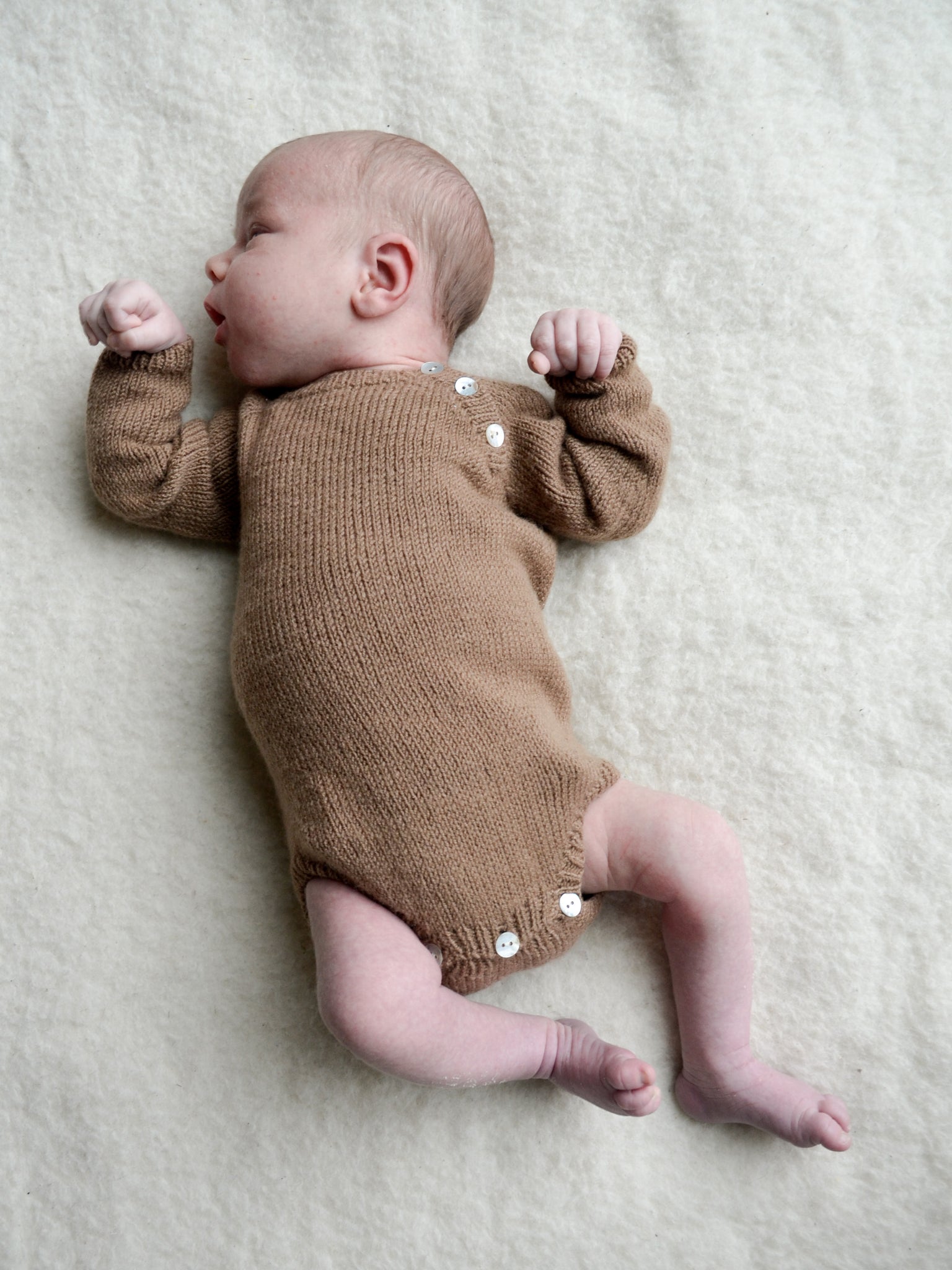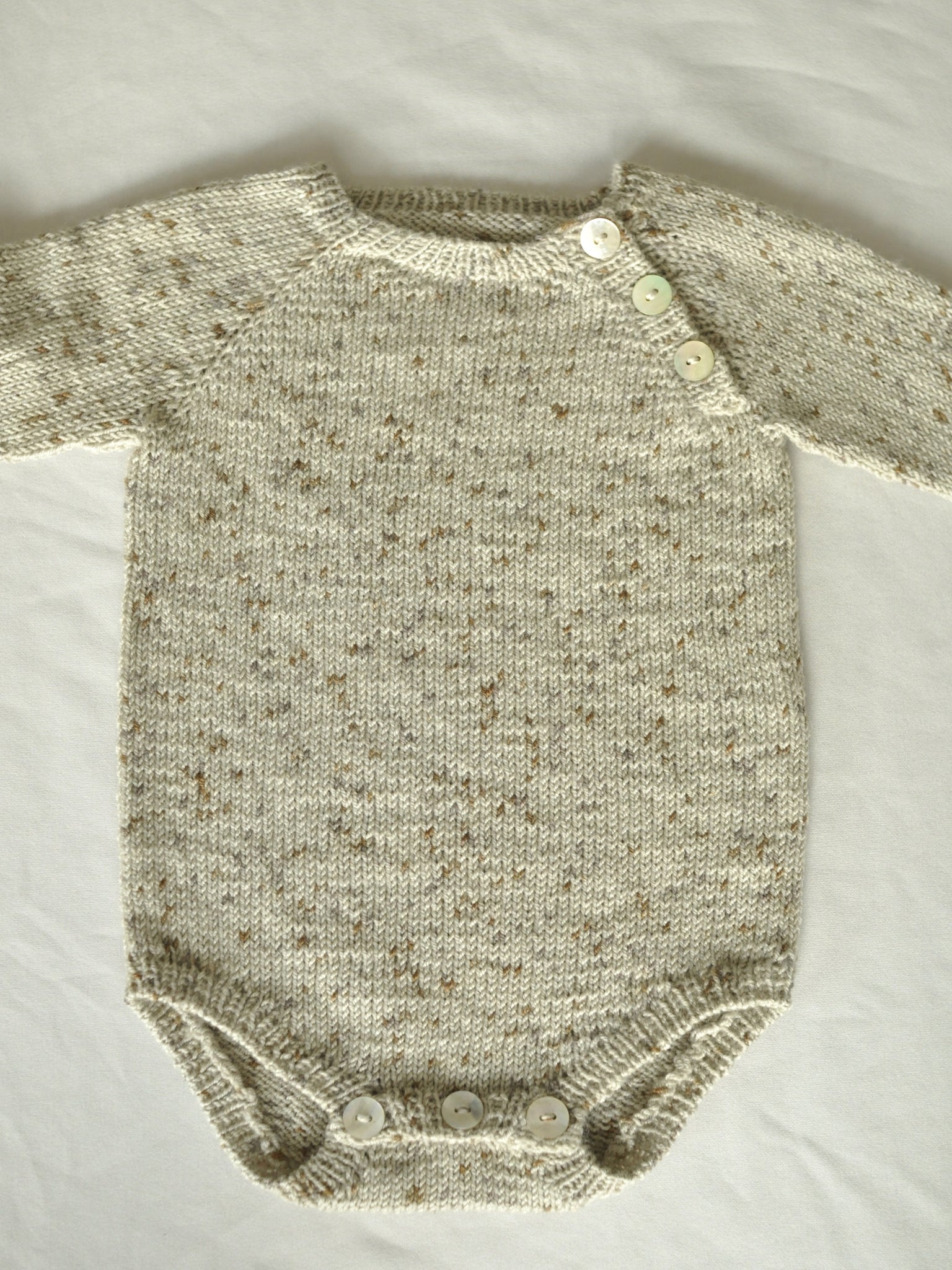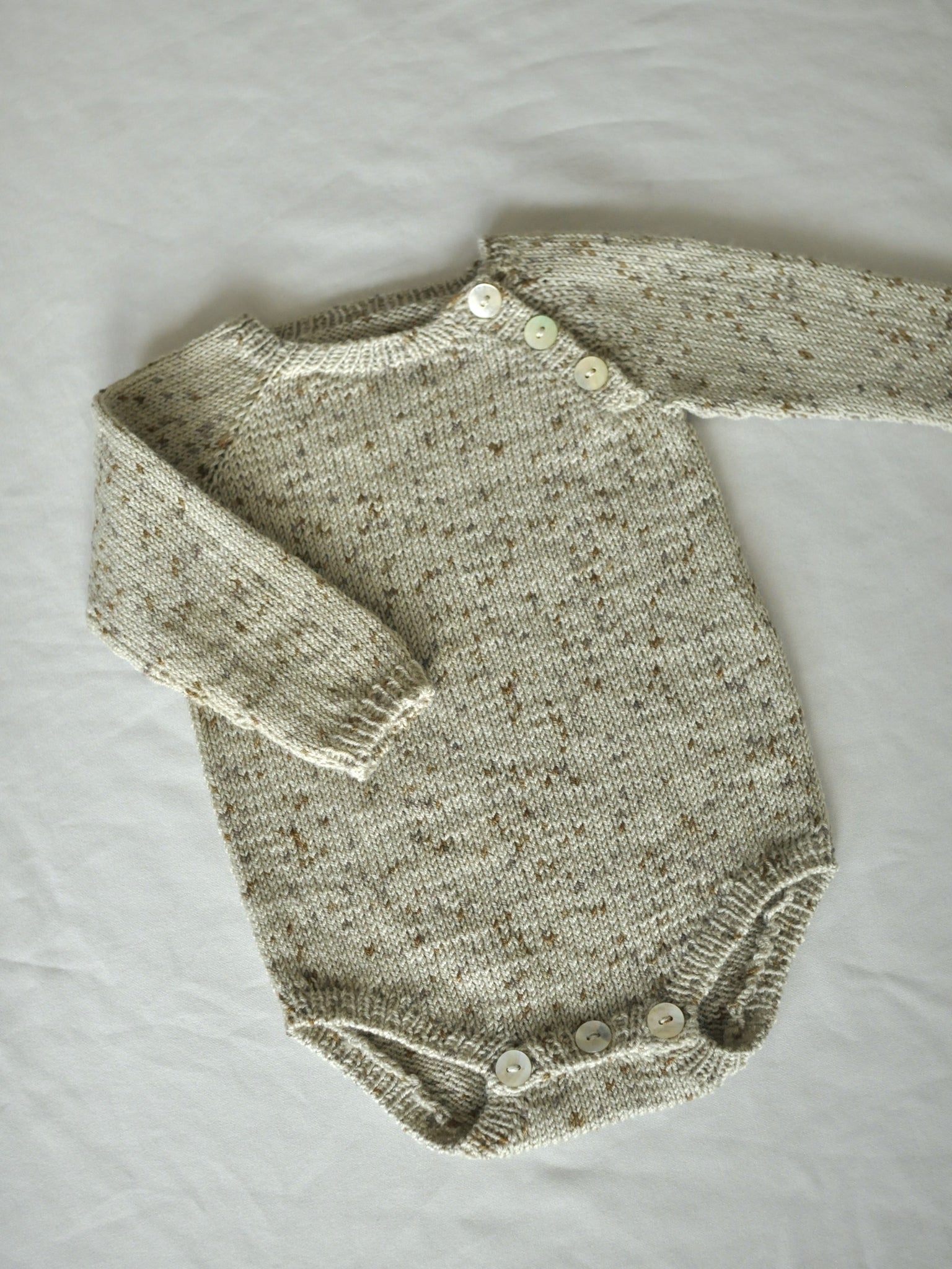 Bodyen har en ettersittende passform og strikkes ovenfra og ned i glattstrikk. Først strikkes den frem og tilbake på rundpinne for å lage en knappeåpning på bærestykket, og med vendinger for få den litt høyere bak. Det økes med raglanøkninger. Etter bolen deles den i for- og bakstykke for å lage benåpninger, som strikkes frem og tilbake hver for seg. Det hentes opp masker til benkanter og knappestolper som strikkes til slutt. Det er brukt italiensk opplegg og avfelling for at det ikke skal stramme, i tillegg til at det gir et pent resultat. En flott body som kan kle både gutter og jenter, strikk den i en farge du liker.