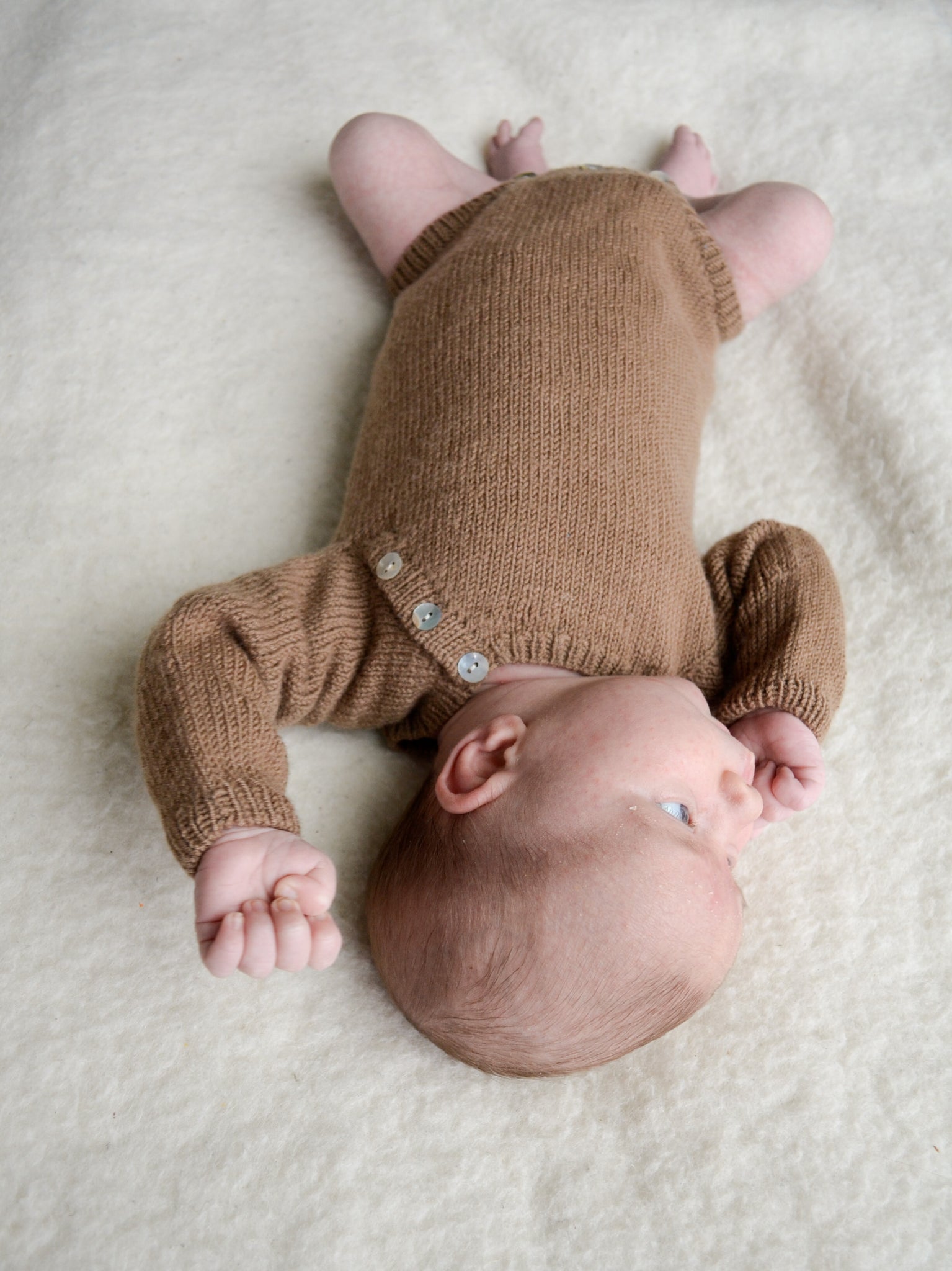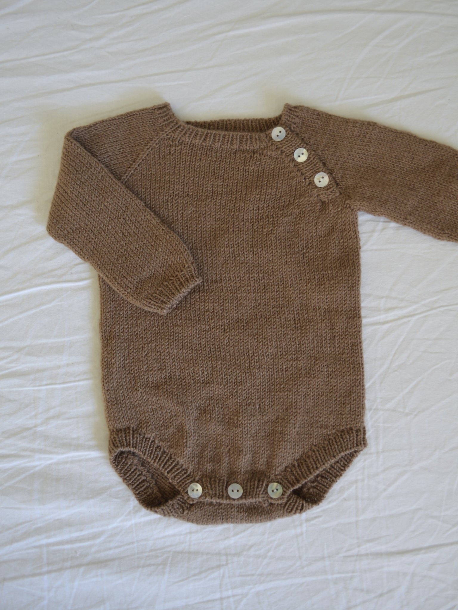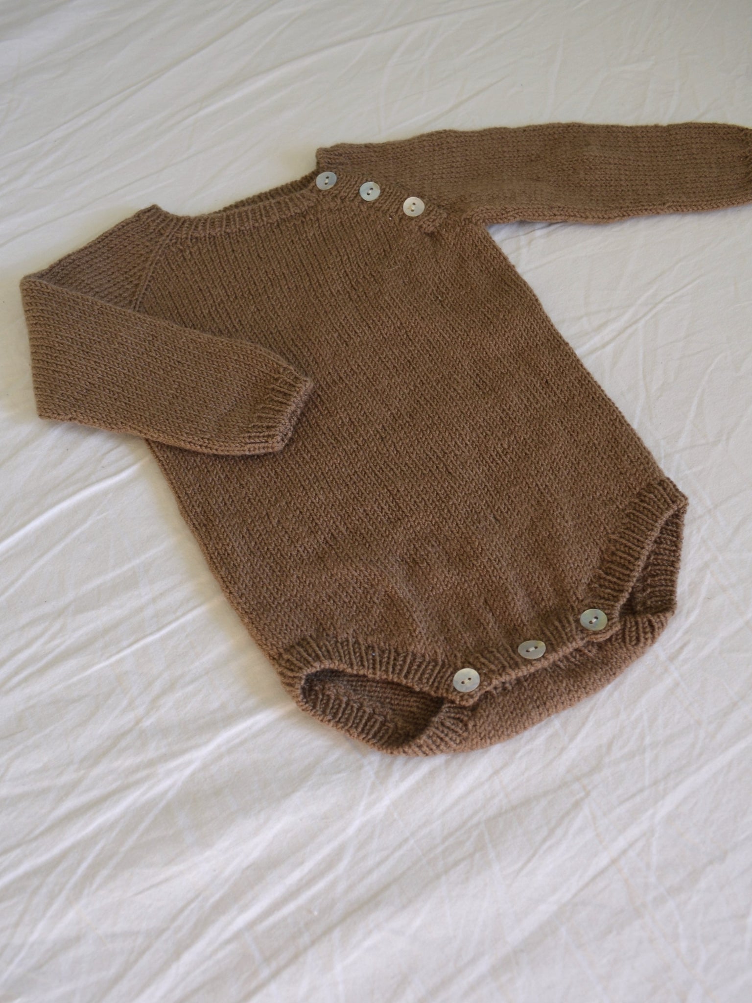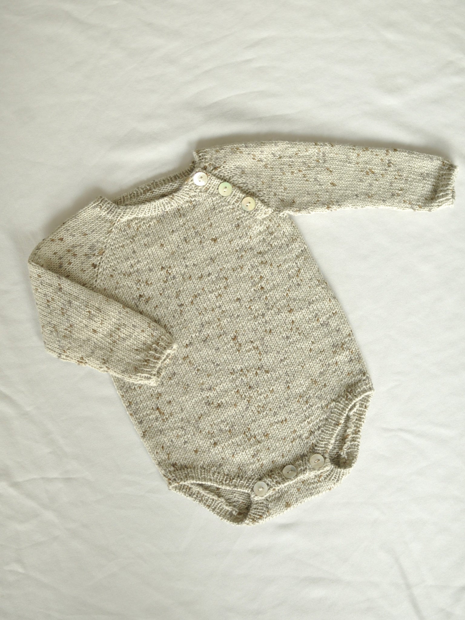 Bodyen har en ettersittende passform og strikkes ovenfra og ned i glattstrikk. Først strikkes den frem og tilbake på rundpinne for å lage en knappeåpning på bærestykket, og med vendinger for få den litt høyere bak. Det økes med raglanøkninger. Etter bolen deles den i for- og bakstykke for å lage benåpninger, som strikkes frem og tilbake hver for seg. Det hentes opp masker til benkanter og knappestolper som strikkes til slutt. Det er brukt italiensk opplegg og avfelling for at det ikke skal stramme, i tillegg til at det gir et pent resultat. En flott body som kan kle både gutter og jenter, strikk den i en farge du liker.
