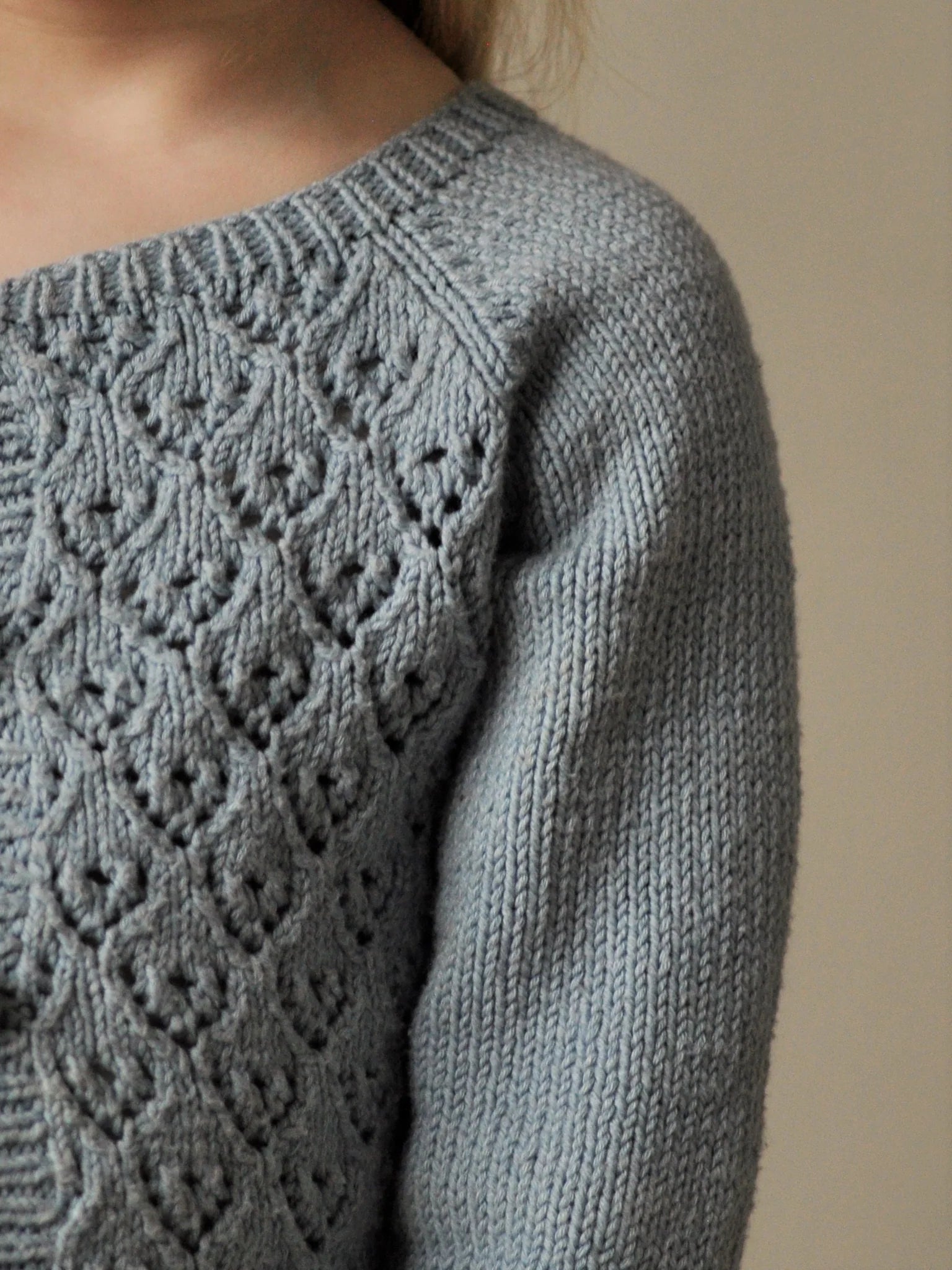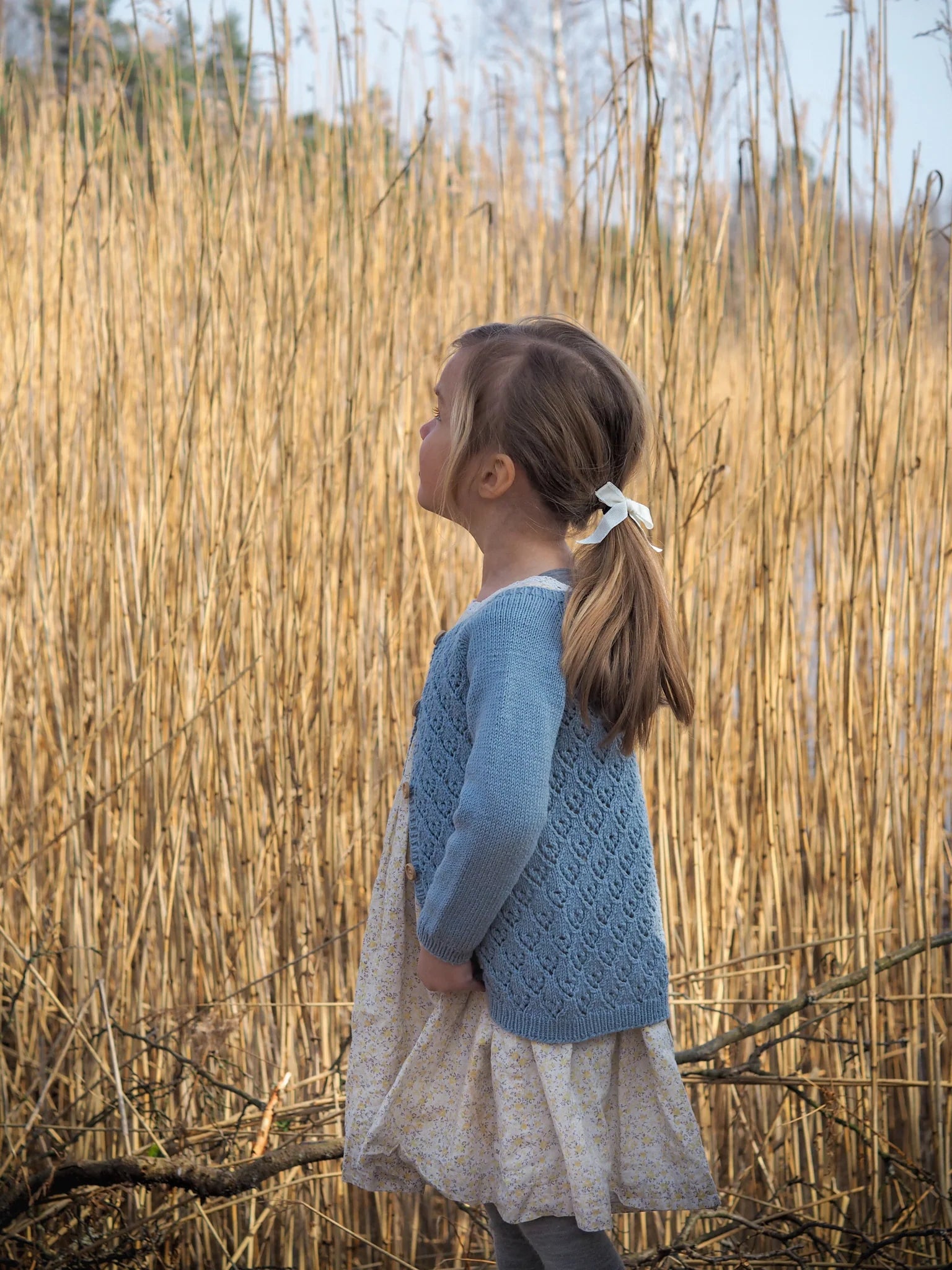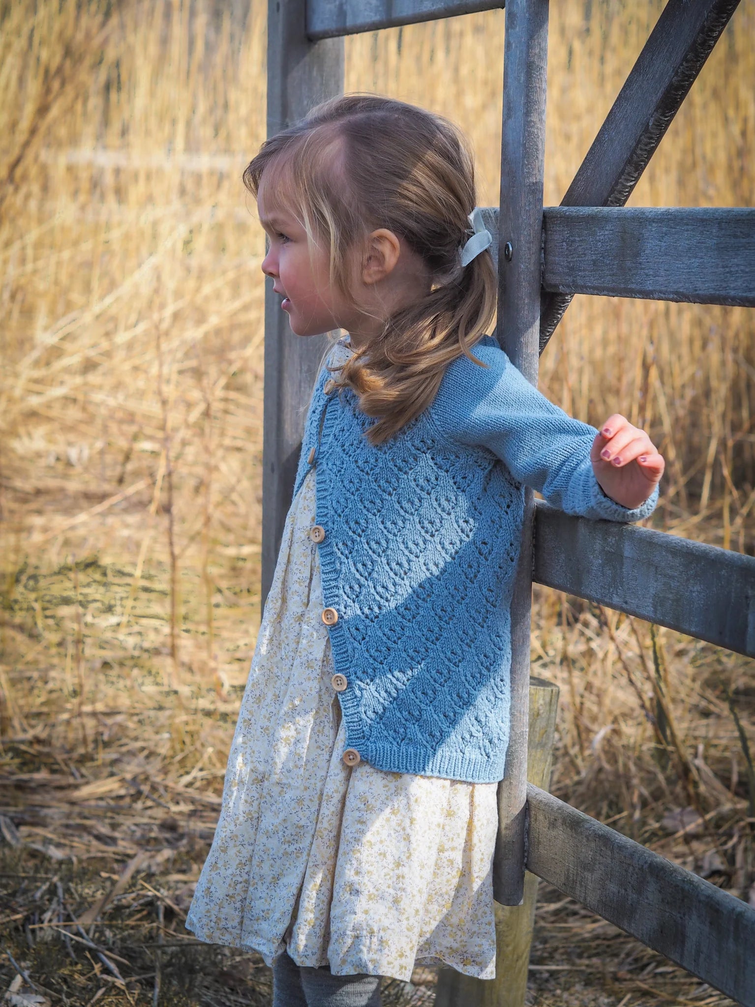 Jakken strikkes nedenfra og opp, i en nydelig, gjentakende struktur. Bolen strikkes frem og tilbake på pinnen og ermene strikkes hver for seg i glattstrikk. Delene settes sammen fra vrangsiden før bærestykket strikkes frem og tilbake med raglanfelling. Det hentes opp masker til knappestolpene som strikkes til slutt. Denne jakken kan brukes til både fint og til hverdags. Den strikkes i et blandingsgarn av ull og bomull. Dersom du ønsker en varmere variant kan du velge et av garnalternativene. En nydelig jakke du kan kose deg med å strikke.